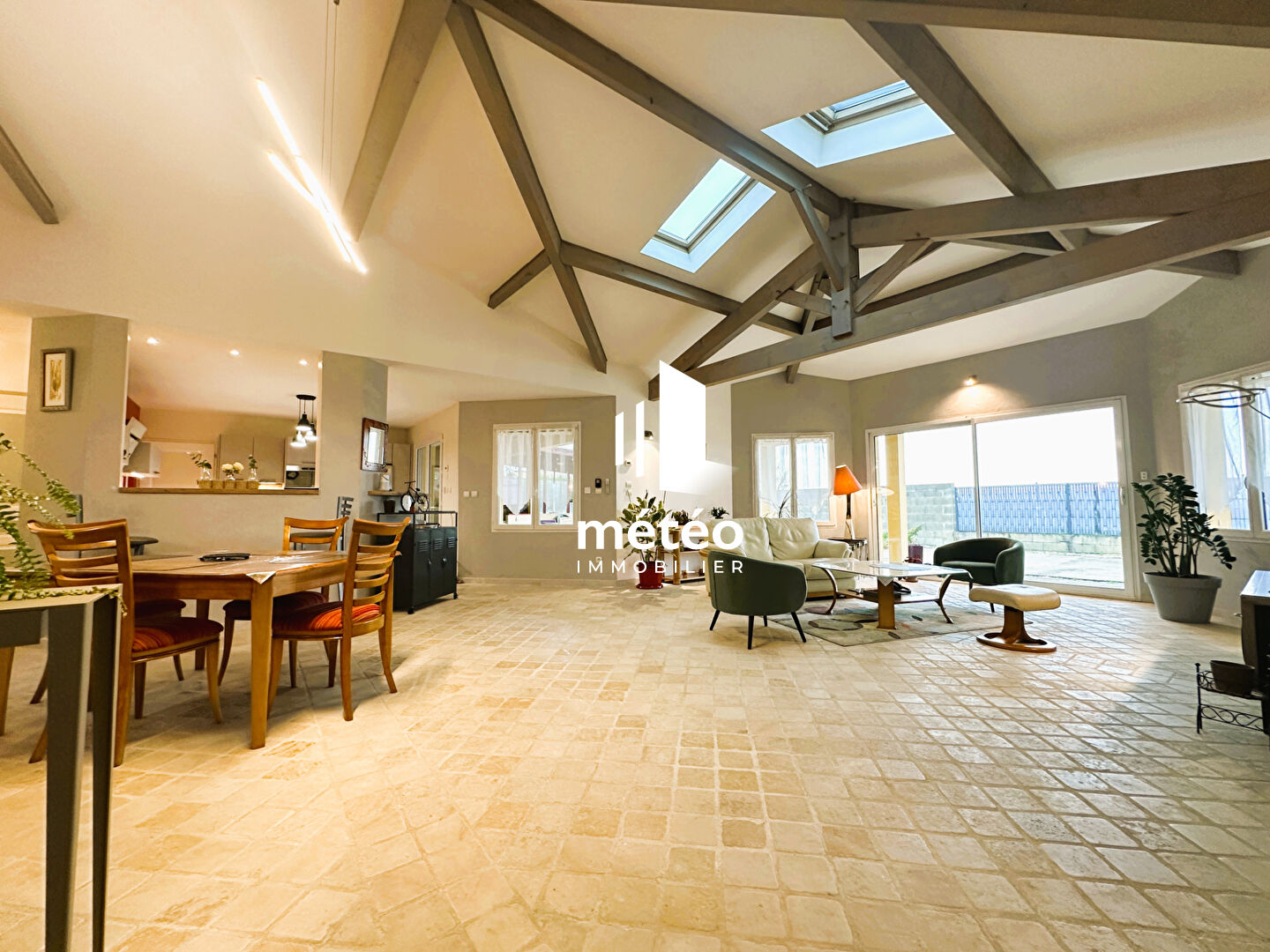 La pièce de vie, spacieuse et bien pensée, dispose d'une cuisine ouverte (pouvant être séparée selon l'envie) entièrement aménagée et équipée, ainsi que d'un salon lumineux et chaleureux avec insert et chauffage au sol, parfait pour les soirées d'hiver.